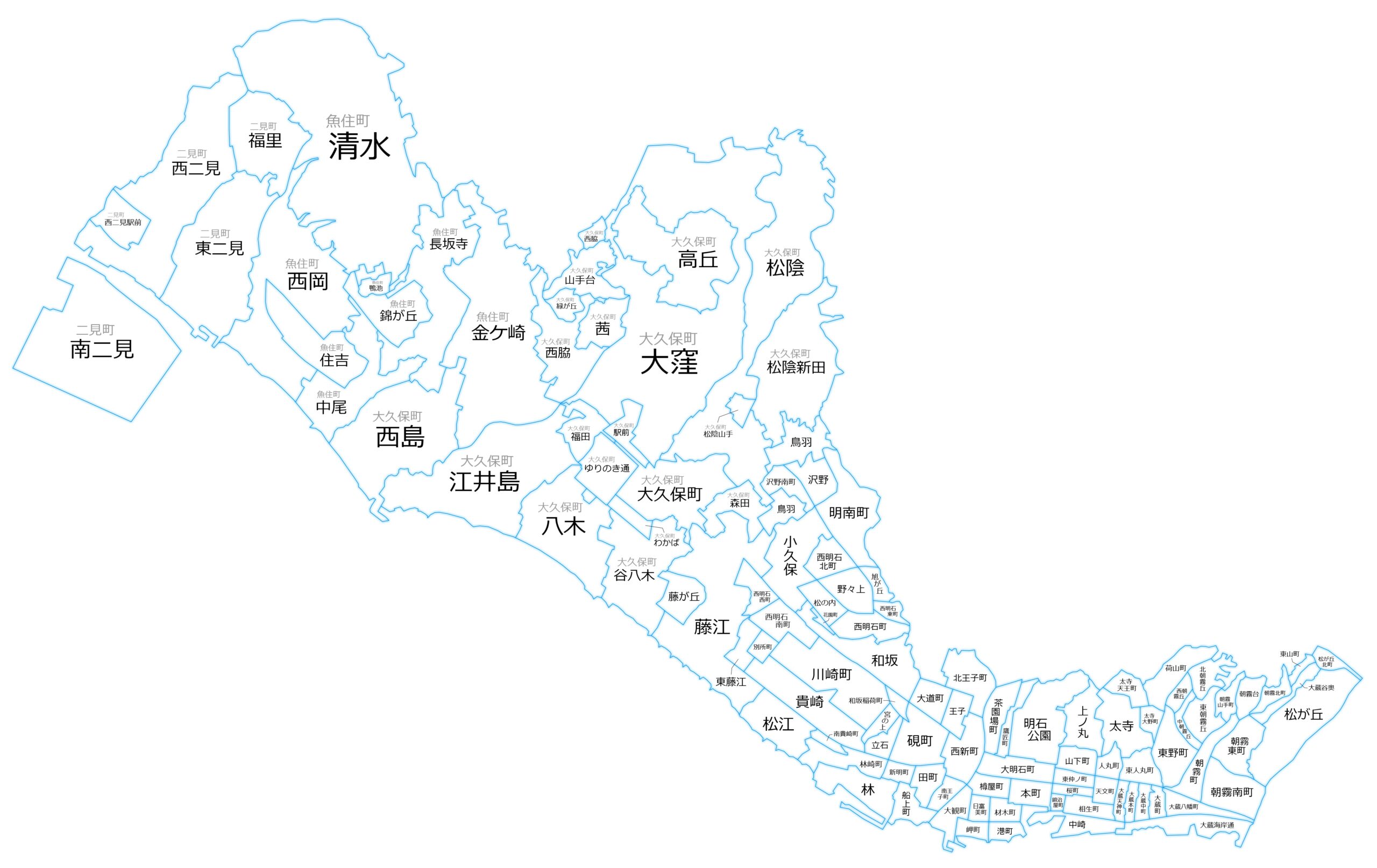 福田、大久保町駅前、ゆりのき通、八木、大久保町大久保町、わかば、谷八木、藤が丘、藤江、森田、鳥羽、沢野南町、沢野、明南町、小久保、西明石北町、西明石西町、西明石南町、東藤江、別所町、旭が丘、野々上、松の内、花園町、西明石東町、西明石町、和坂、川崎町、貴崎、松江、和坂稲荷町、宮の上、立石、林崎町、南貴崎町、林、大道町、硯町、神明町、北王子町、王子、田町、船上町、南王子町、西新町、大観町、荷山町、東野町、西朝霧丘、北朝霧丘、中朝霧丘、東朝霧丘、朝霧山手町、朝霧町、朝霧台、朝霧東町、朝霧南町、朝霧北町、東山町、松が丘北町、大蔵谷奥、松が丘、西二見駅前