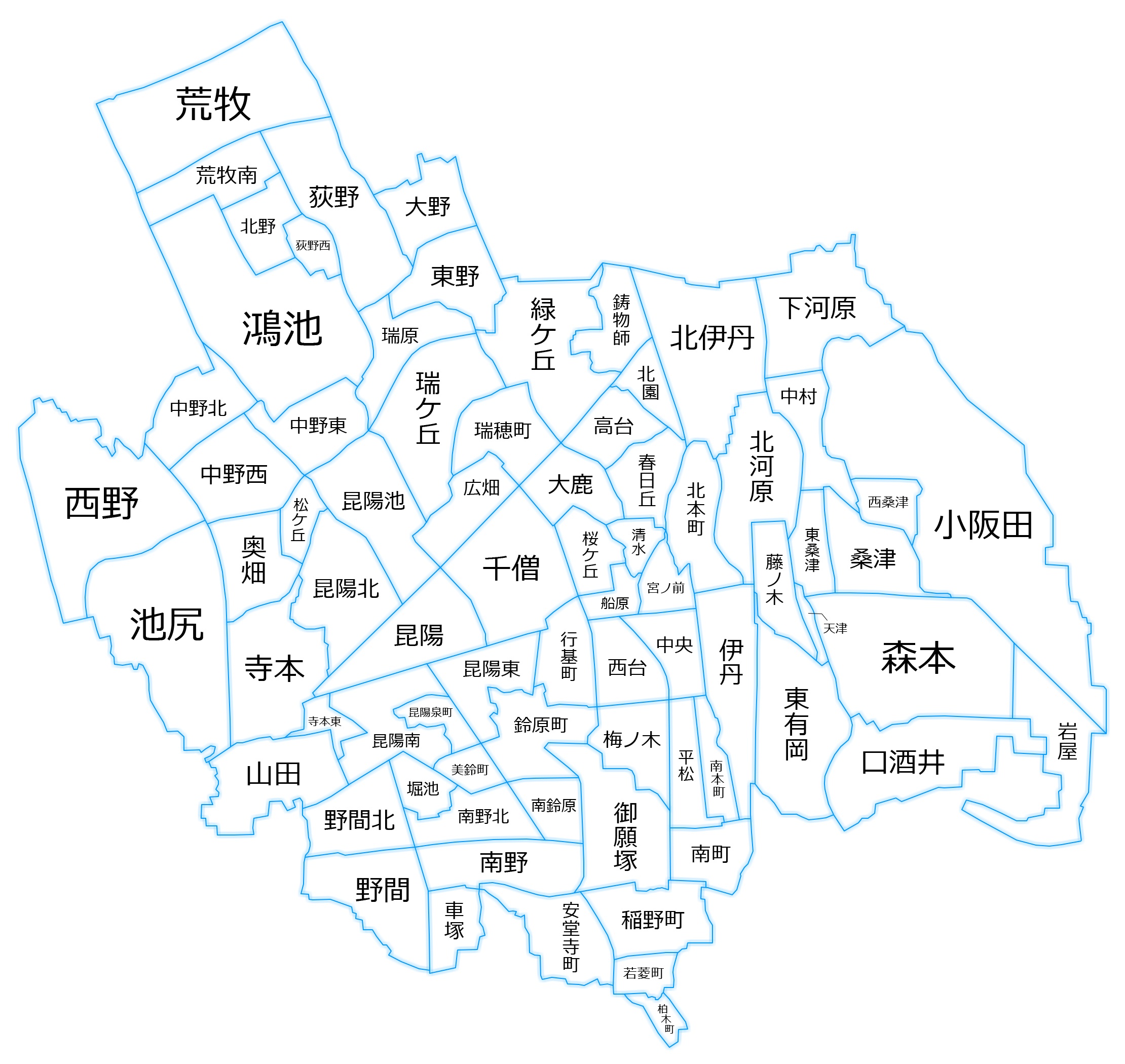 高台、春日丘、北本町、大鹿、清水、桜ヶ丘、千僧、伊丹、宮ノ前、船原、中央、西台、行基町、南本町、平松、梅ノ木、鈴原町、昆陽東、昆陽、昆陽泉町、昆陽南、南町、御願塚、南鈴原、南野北、美鈴町、堀池、稲野町、若菱町、柏木町、安堂寺町、南野、車塚、野間、野間北