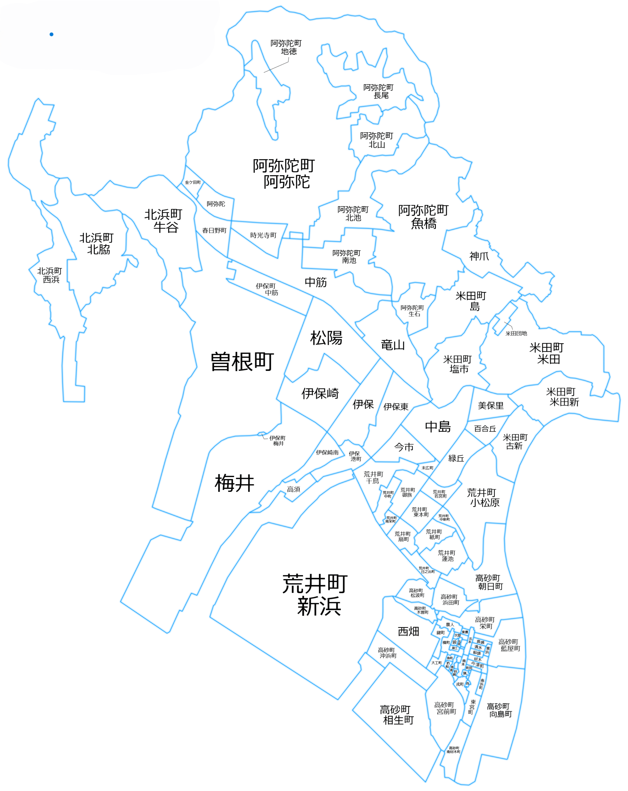 南材木町、宮前町、南浜町、東宮町、戎町、西宮町、田町、今津町、魚町、大工町、釣船町、狩網町、猟師町、南本町、南渡海町、北渡海町、横町、北本町、材木町、東浜町、船頭町、細工町、鍛治屋町、清水町、高瀬町、次郎助町、藍屋町、向島町、東農人町、農人町、鍵町、栄町、松波町、市営松波団地、県営松波団地、木曽町、沖浜町、朝日町、浜田町、西畑、県営高砂鉄筋団地、中筋、神爪、西浜、北脇